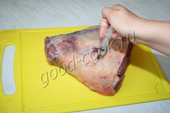 Получившимся рассолом нашприцевать мясо. Проколов нужно стараться сделать